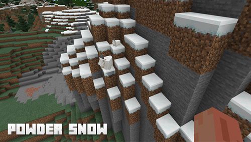 As for the blocks in the mountains, a new block will be added to the Minecraft world, namely Powder Snow. Going on a new adventure in the mountains, you should be even more careful, since due to the fact that the entire biome is covered with snow, you can accidentally fall into a trap in the form of powder snow. This block is different from a simple snow block, but much more dangerous. If you step on such a block, you will fall through and fall into a trap in which your health will gradually be taken away, which in the end can lead to the fact that you will die.